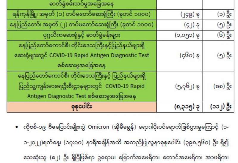 ကျန်းမာရေးဝန်ကြီးဌာနအနေဖြင့် နိုင်ငံအတွင်း ကူးစက်ဖြစ်ပွားနေသော COVID-19 ရောဂါ ကာကွယ်၊ ကုသ၊ ထိန်းချုပ်ရေးလုပ်ငန်းများကို အရှိန်အဟုန်မြှင့် ဆောင်ရွက်လျက်ရှိပါသည်။