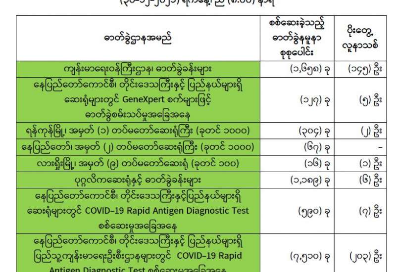 ကျန်းမာရေးဝန်ကြီးဌာနအနေဖြင့် နိုင်ငံအတွင်း ကူးစက်ဖြစ်ပွားနေသော COVID-19 ရောဂါ ကာကွယ်၊ ကုသ၊ ထိန်းချုပ်ရေးလုပ်ငန်းများကို အရှိန်အဟုန်မြှင့်ဆောင်ရွက်လျက်ရှိပါသည်။