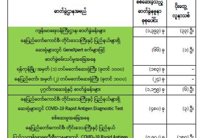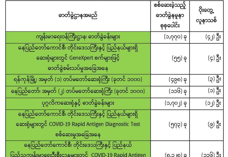 ကျန်းမာရေးဝန်ကြီးဌာနအနေဖြင့် နိုင်ငံအတွင်း ကူးစက်ဖြစ်ပွားနေသော COVID-19 ရောဂါ ကာကွယ်၊ ကုသ၊ ထိန်းချုပ်ရေး လုပ်ငန်းများကို အရှိန်အဟုန်မြှင့် ဆောင်ရွက်လျက်ရှိပါသည်။