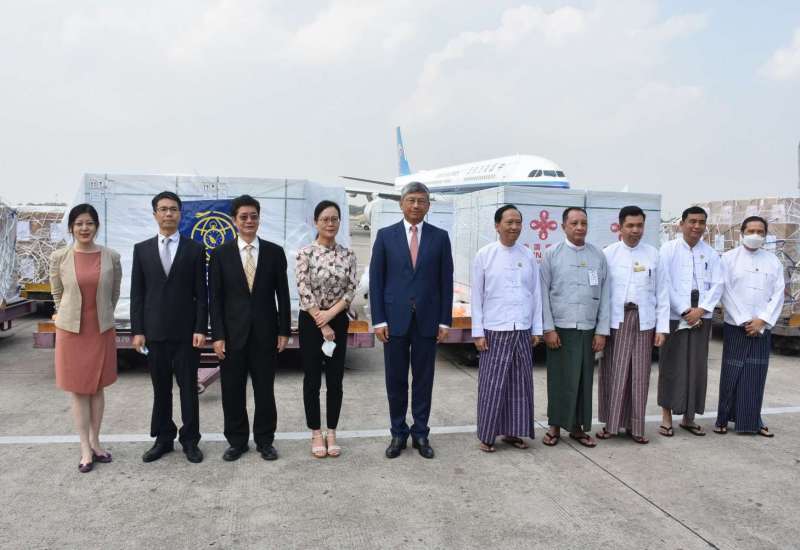 တရုတ်ပြည်သူ့သမ္မတနိုင်ငံမှ မြန်မာနိုင်ငံသို့လှူဒါန်းသည့် ကိုဗစ်-၁၉ ရောဂါ ကာကွယ်ဆေး Sinovac doses (၁) သန်းသည် ယနေ့နံနက် ၁၀ နာရီအတွင် ရန်ကုန်အပြည်ပြည်ဆိုင်ရာ လေဆိပ်သို့ CZ 8083 လေကြောင်းလိုင်းဖြင့်ရောက်ရှိလာပြီး ကာကွယ်ဆေးများ လွှဲပြောင်းလက်ခံခြင်း အခမ်းအနားကို ရန်ကုန် အပြည်ပြည်ဆိုင်ရာ လေဆိပ်ရှိ အရေးကြီးပုဂ္ဂိုလ်များ ဧည့်ခန်းမဆောင်တွင်ကျင်းပရာ ကျန်းမာရေးဝန်ကြီးဌာန ပြည်ထောင်စုဝန်ကြီး ဒေါက်တာ သက်ခိုင်ဝင်း နှင့် တရုတ်ပြည်သူ့သမ္မတနိုင်ငံ သံအမတ်ကြီး မစ္စတာချန်းဟိုင်တို့ တက်ရောက်ကြ သည်။