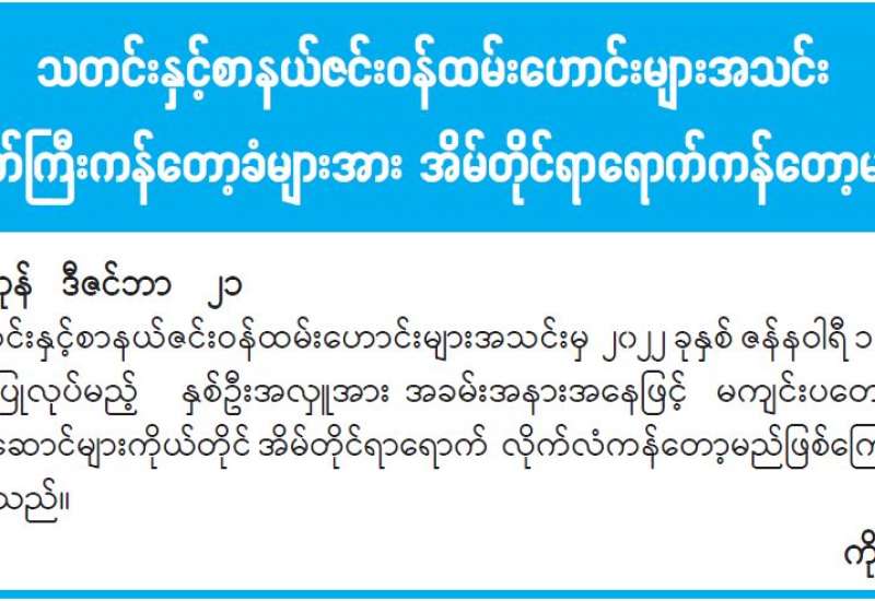 ပြန်ကြားရေးဝန်ကြီးဌာန ပြည်ထောင်စုဝန်ကြီး ဦးမောင်မောင်အုန်းသည် ယနေ့နံနက်ပိုင်းတွင် ရန်ကုန်မြို့ ပြည်လမ်းရှိ မြန်မာ့အသံနှင့် ရုပ်မြင်သံကြား အစည်းအဝေးခန်းမ၌ (၇၅) နှစ်မြောက် စိန်ရတု ပြည်ထောင်စုနေ့ ဂုဏ်ပြု “တူယှဉ်နွှဲပျော် ဂီတပွဲတော်" သီချင်းဆိုပြိုင်ပွဲ အုပ်စု (ဂ) တွင် ယှဉ်ပြိုင်မည့် တိုင်းဒေသကြီးနှင့် ပြည်နယ်များမှ ပြိုင်ပွဲဝင် ကိုးဦးအား တွေ့ဆုံနှုတ်ဆက်သည်။