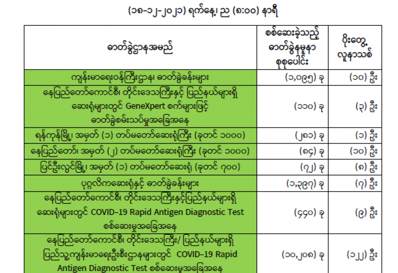 (၁၈-၁၂-၂၀၂၁) ရက်နေ့၊ ည (၈:၀၀) နာရီ ကျန်းမာရေးဝန်ကြီးဌာနအနေဖြင့် နိုင်ငံအတွင်း ကူးစက်ဖြစ်ပွားနေသော COVID-19 ရောဂါ ကာကွယ်၊ ကုသ၊ ထိန်းချုပ်ရေးလုပ်ငန်းများကို အရှိန်အဟုန်မြှင့်ဆောင်ရွက်လျက်ရှိပါသည်။
