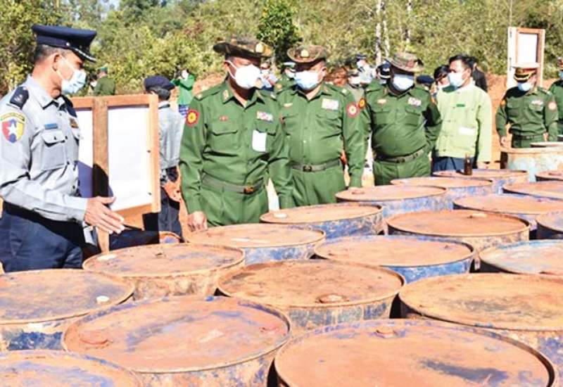 မူးယစ်ဆေးဝါးချက်လုပ်ရာတွင် အသုံးပြုသည့် ဓာတုပစ္စည်းများနှင့် ဆက်စပ် ပစ္စည်းများ ဖျက်ဆီးခြင်းကို ယနေ့နံနက်ပိုင်းတွင် ရှမ်းပြည်နယ်(တောင်ပိုင်း)၊ ခိုလမ်မြို့၊ ခိုလမ်-ကျိုင်းတောင်းသွားကားလမ်းဘေး၌ ပြုလုပ်ရာ အရှေ့အလယ်ပိုင်းတိုင်းစစ်ဌာနချုပ် တိုင်းမှူး ဗိုလ်မှူးချုပ် လှမိုးနှင့် အဖွဲ့ဝင်များ၊ မြန်မာနိုင်ငံ ရဲတပ်ဖွဲ့ဝင်များ၊ ကျန်းမာရေးဝန်ထမ်းများ၊ ပြည်သူ့စစ်(ဌာနေ)တပ်ဖွဲ့ဝင်များနှင့် ဌာနဆိုင်ရာတာဝန်ရှိသူများ တက်ရောက်ကြသည်။