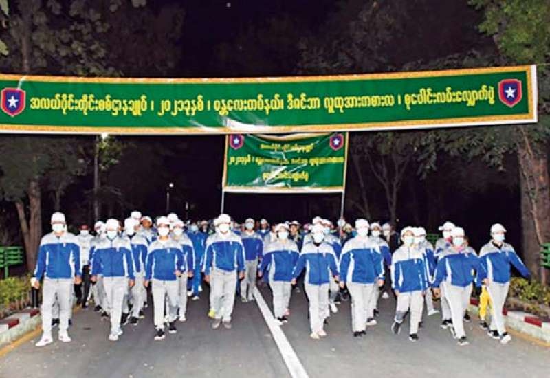 ၂၀၂၁ ခုနှစ် ဒီဇင်ဘာအားကစား လ စုပေါင်းလမ်းလျှောက်ပွဲကို ယနေ့နံနက်ပိုင်းတွင်ရန်ကုန်တိုင်း စစ်ဌာနချုပ်နှင့် အလယ်ပိုင်းတိုင်း စစ်ဌာနချုပ်တို့၌ ပြုလုပ်ရာ တိုင်းဒေသကြီး ဝန်ကြီးချုပ်၊ သက်ဆိုင်ရာ တိုင်းစစ်ဌာနချုပ် များမှ တိုင်းမှူးများနှင့် အရာရှိ၊ စစ်သည်၊ မိသားစုများ ပါဝင် ဆင်နွှဲကြသည်။