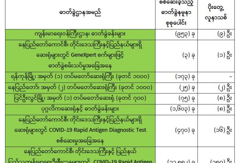 ကျန်းမာရေးဝန်ကြီးဌာနအနေဖြင့် နိုင်ငံအတွင်း ကူးစက်ဖြစ်ပွားနေသော COVID-19 ရောဂါ ကာကွယ်၊ ကုသ၊ ထိန်းချုပ်ရေးလုပ်ငန်းများကို အရှိန်အဟုန်မြှင့် ဆောင်ရွက်လျက်ရှိပါသည်။