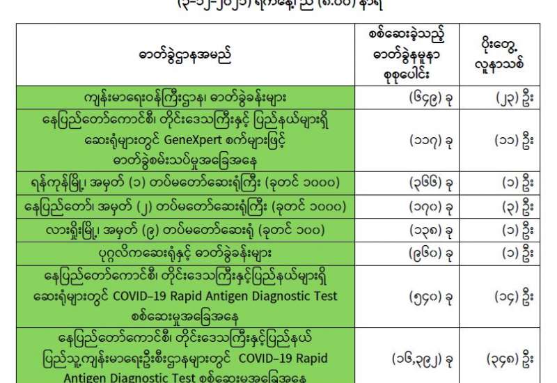 ကျန်းမာရေးဝန်ကြီးဌာနအနေဖြင့် နိုင်ငံအတွင်း ကူးစက်ဖြစ်ပွားနေသော COVID-19 ရောဂါ ကာကွယ်၊ ကုသ၊ ထိန်းချုပ်ရေးလုပ်ငန်းများကို အရှိန်အဟုန်မြှင့်ဆောင်ရွက်လျက်ရှိပါသည်။