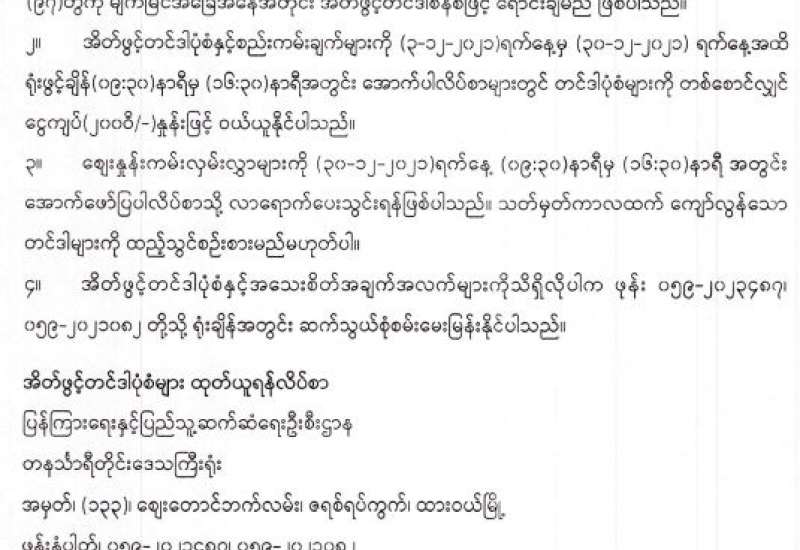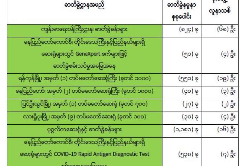 ကျန်းမာရေးဝန်ကြီးဌာနအနေဖြင့် နိုင်ငံအတွင်း ကူးစက်ဖြစ်ပွားနေသော COVID-19 ရောဂါ ကာကွယ်၊ ကုသ၊ ထိန်းချုပ်ရေး လုပ်ငန်းများကို အရှိန်အဟုန်မြှင့် ဆောင်ရွက်လျက်ရှိရာ ရောဂါ ထိန်းချုပ်ရေးလုပ်ငန်းများ အောင်မြင်နိုင်ရေးအတွက် ပြည်သူလူထု အနေဖြင့် ကျန်းမာရေး ဝန်ကြီးဌာနမှ ထုတ်ပြန်ထားသော COVID-19 ရောဂါ ကာကွယ်ထိန်းချုပ်ရေးဆိုင်ရာ စည်းကမ်းများကို စနစ်တကျ လိုက်နာဆောင်ရွက်ရန်လိုအပ်ပြီး COVID-19 ကာကွယ်ဆေး ထိုးနှံမှုခံယူခြင်းအား အထူးဂရုပြု ပူးပေါင်း ဆောင်ရွက်ကြရန် လိုအပ်ပါသည်။