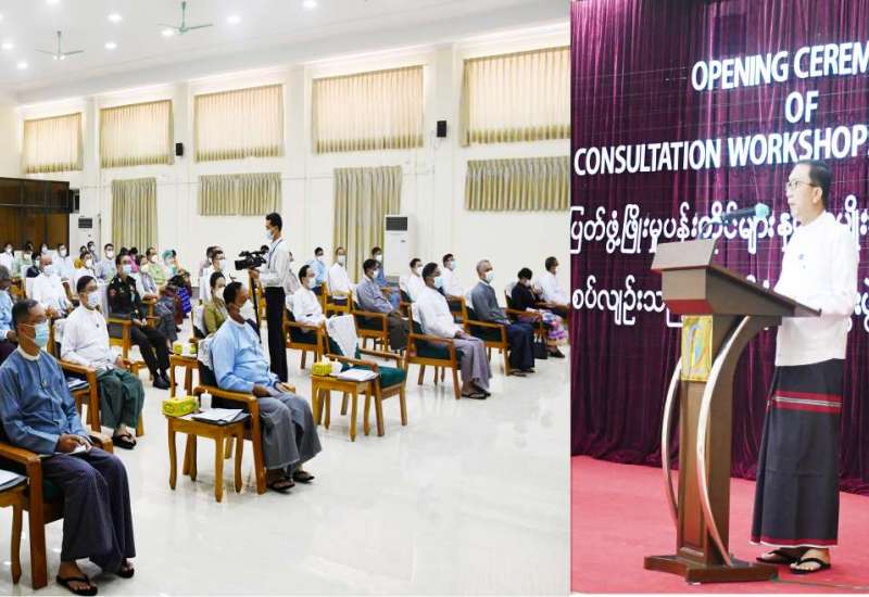 နိုင်ငံတော်စီမံအုပ်ချုပ်ရေးကောင်စီ၊ သတင်းထုတ်ပြန်ရေးအဖွဲ့၏ (၁၀/၂၀၂၁)ကြိမ်မြောက် သတင်းစာရှင်းလင်းပွဲအခမ်းအနားကို နိုဝင်ဘာ ၂၆ ရက် မွန်းလွဲပိုင်းက ပြန်ကြားရေး ဝန်ကြီးဌာန၌ ကျင်းပပြုလုပ်ရာ နိုင်ငံတော်စီမံအုပ်ချုပ်ရေးကောင်စီ၊ သတင်းထုတ်ပြန်ရေး အဖွဲ့ခေါင်းဆောင် ဗိုလ်ချုပ်ဇော်မင်းထွန်းနှင့် ပြည်ထောင်စုရွေးကောက်ပွဲ ကော်မရှင်အဖွဲ့ဝင် ဦးခင်မောင်ဦးတို့က သတင်းမီဒီယာများ၏ သိရှိလိုသည့် မေးမြန်းမှုများကို ပြန်လည်ဖြေကြားသည်။