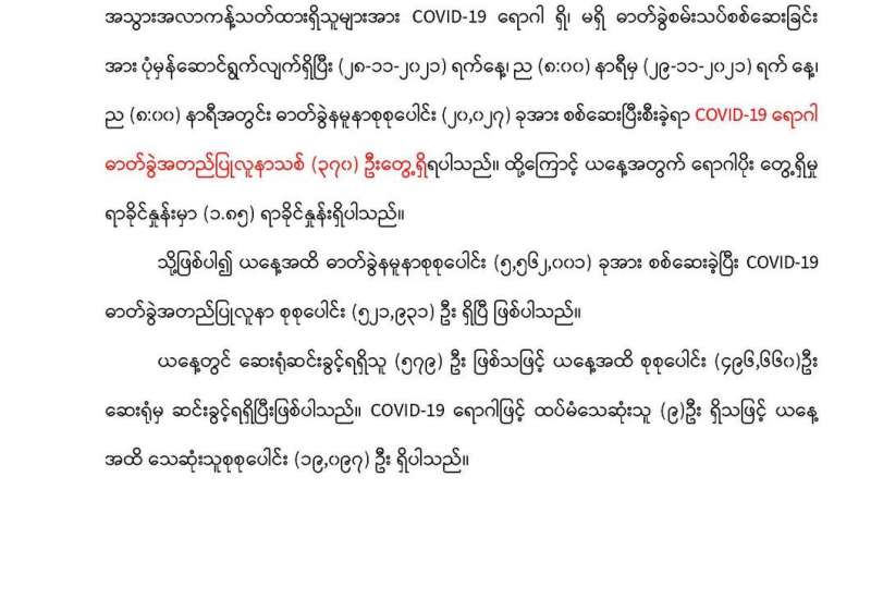 စီးပွားရေးနှင့် ကူးသန်းရောင်းဝယ်ရေးဝန်ကြီးဌာနအနေဖြင့် ကိုဗစ်-၁၉ ရောဂါကာကွယ်၊ ထိန်းချုပ်၊ ကုသရေးဆိုင်ရာပစ္စည်းများကို လေကြောင်း၊ ရေကြောင်းနှင့် နယ်စပ်ကုန်သွယ်ရေး စခန်းများမှ နှောင့်နှေးကြန့်ကြာမှုမရှိ တင်သွင်းနိုင်ရေးအတွက် အချိန်နှင့် တစ်ပြေးညီ စီစဉ်ဆောင်ရွက်ပေးလျက်ရှိရာ ယနေ့တွင် မြဝတီနှင့် ချင်းရွှေဟော် ကုန်သွယ်ရေး စခန်း နှစ်ခုတို့မှ တင်သွင်းရာ၌ ကုမ္ပဏီနှစ်ခုမှ ယာဉ်စီးရေခုနစ်စီးဖြင့် အောက်ဆီဂျင် (အရည်) Bowser ယာဉ်တစ်စီးဖြင့် (၁၉)တန်နှင့် နှာခေါင်းစည်း (Mask) (၄၅) တန်တို့ကို တင်သွင်းခဲ့သည်။ အောက်ဆီဂျင် (အရည်) Bowser ယာဉ်တစ်စီးမှာ မြဝတီကုန်သွယ်ရေးဇုန်မှ ရန်ကုန်မြို့ သို့ဖြစ်ကြောင်း သိရသည်။