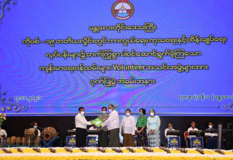 မန္တလေးတိုင်းဒေသကြီးအတွင်း ကိုဗစ်-၁၉ ရောဂါ ကာကွယ်၊ ထိန်းချုပ်၊ ကုသရေး လုပ်ငန်းများတွင် တတ်ကြွစွာပါဝင်ခဲ့သော ကျန်းမာရေးဝန်ထမ်းများ၊ တပ်မတော်သားများနှင့် စေတနာ့ဝန်ထမ်းများအား ဂုဏ်ပြုပွဲကို ယနေ့ညနေပိုင်းတွင် မန္တလေးတိုင်းဒေသကြိး၊ မဟာအောင်မြေမြိုနယ်၊ ရတနာပုံခန်းမ၌ ပြုလုပ်ရာ မန္တလေးတိုင်းဒေသကြီး ဝန်ကြီးချုပ် ဦးမောင်ကို၊ အလယ်ပိုင်းတိုင်းစစ်ဌာနချုပ် တိုင်းမှူး ဗိုလ်ချုပ် ကိုကိုဦး၊ ဌာနဆိုင်ရာ တာဝန် ရှိသူများနှင့် စေတနာ့ဝန်ထမ်းများ တက်ရောက်ကြသည်။