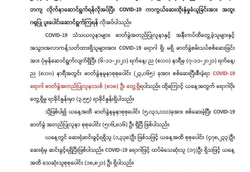 ကျန်းမာရေးဝန်ကြီးဌာနသည် ကိုဗစ်-၁၉ ရောဂါ ကာကွယ်ထိန်းချုပ်ရေးအတွက် တိုင်းဒေသကြီး/ ပြည်နယ်များတွင် ကိုဗစ်-၁၉ရောဂါ ကာကွယ်ဆေးကို ဦးတည်အုပ်စုများသတ်မှတ်၍ ထိုးနှံပေးလျက် ရှိသည်။