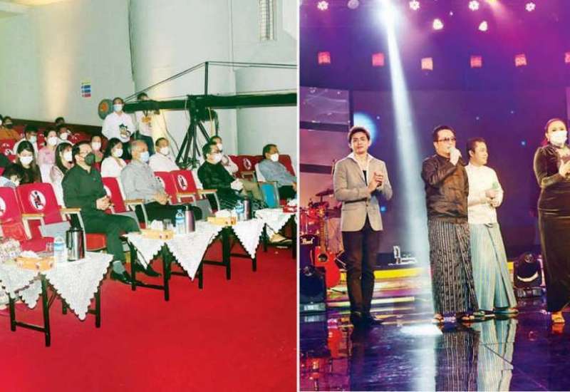 ပြန်ကြားရေးဝန်ကြီးဌာန ပြည်ထောင်စုဝန်ကြီး ဦးမောင်မောင်အုန်းနှင့်ရင်းနှီးမြှုပ်နှံမှုနှင့် နိုင်ငံခြားစီးပွားဆက်သွယ် ရေးဝန်ကြီးဌာန ပြည်ထောင်စုဝန်ကြီး ဦးအောင်နိုင်ဦးတို့သည် ယမန်နေ့ ညပိုင်း က ရန်ကုန်မြို့ မြန်မာ့အသံနှင့် ရုပ်မြင် သံကြားတွင် ပြုလုပ်သည့် အနုပညာရှင် များ တေးဂီတဖျော်ဖြေမှု ရိုက်ကူး ထုတ်လွှင့်ခြင်းကို ကြည့်ရှုအားပေးပြီး အနုပညာရှင်များအား ရင်းရင်းနှီးနှီး တွေ့ဆုံ နှုတ်ဆက်သည်။