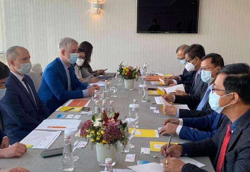 ရုရှားဖက်ဒရေးရှင်းနိုင်ငံ၌ ကျင်းပပြုလုပ်သော Russian Energy Week International Forum (REW 2021)သို့တက်ရောက်ရန် မော်စကိုမြို့၌ ရောက်ရှိနေသည့် လျှပ်စစ်နှင့် စွမ်းအင်ဝန်ကြီးဌာန ပြည်ထောင်စုဝန်ကြီး ဦးအောင်သန်းဦးနှင့်အဖွဲ့သည် အောက်တိုဘာ ၁၂ ရက်တွင် ရုရှားနိုင်ငံရှိ လျှပ်စစ်နှင့်စွမ်းအင်ကဏ္ဍဆိုင်ရာကုမ္ပဏီနှင့် အသင်းအဖွဲ့များမှ တာဝန်ရှိသူများနှင့် နှစ်နိုင်ငံရင်းနှီးမြှုပ်နှံမှုဆိုင်ရာ ကိစ္စရပ်များနှင့် ပတ်သက်၍ တွေ့ဆုံဆွေးနွေးသည်။