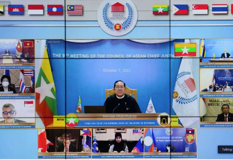 အင်ဒိုနီးရှားသမ္မတနိုင်ငံ၊ တရားရုံးချုပ်မှကြီးမှူး၍ “(၉) ကြိမ်မြောက် အာဆီယံတရားသူကြီးချုပ် များကောင်စီ အစည်းအဝေး (The 9th Meeting of the Council of ASEAN Chief Justices)” ကို ယနေ့ နံနက် ၈ နာရီတွင် ဗီဒီယိုကွန်ဖရင့်စနစ်ဖြင့် ကျင်းပရာ ပြည်ထောင်စုတရားသူကြီးချုပ် ဦးထွန်းထွန်းဦးသည် နေပြည်တော်ရှိ ပြည်ထောင်စုတရား လွှတ်တော်ချုပ်ရုံးမှ ပါဝင်တက် ရောက်သည်။