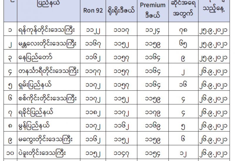 စီးပွားရေးနှင့် ကူးသန်းရောင်းဝယ်ရေးဝန်ကြီးဌာနနှင့် မြန်မာနိုင်ငံ စက်သုံးဆီတင်သွင်း ဖြန့်ဖြူးရောင်းချရေးအသင်းတို့ ပူးပေါင်းစီစဉ်မှုဖြင့် ပြည်သူများ သက်သာသောဈေးနှုန်းဖြင့် ဝယ်ယူရရှိနိုင်ရန်ရည်ရွယ်၍ ဗဟိုဘဏ်မှ ရည်ညွှန်းငွေလဲနှုန်းဖြင့် တိုက်ရိုက်ရောင်းချပေးသည့် နိုင်ငံခြားငွေဖြင့် မှာယူတင်သွင်းခဲ့သည့် စက်သုံးဆီများကို စက်တင်ဘာ ၂၂ ရက်မှ စတင်၍ တိုင်းဒေသကြီး/ ပြည်နယ်များရှိ စက်သုံးဆီအရောင်းဆိုင် ၂၁၃ ဆိုင်တွင် Ron92 လီတာ ၆၃၄၀၇၄၀၊ ဒီဇယ် ၆၂၄၁၃၂၃ လီတာ နှင့် Premium ဒီဇယ် ၅၇၉၃၅၅၆ လီတာတို့ ဖြန့်ဖြူးရောင်းချပေးထားပြီးဖြစ်သည်။