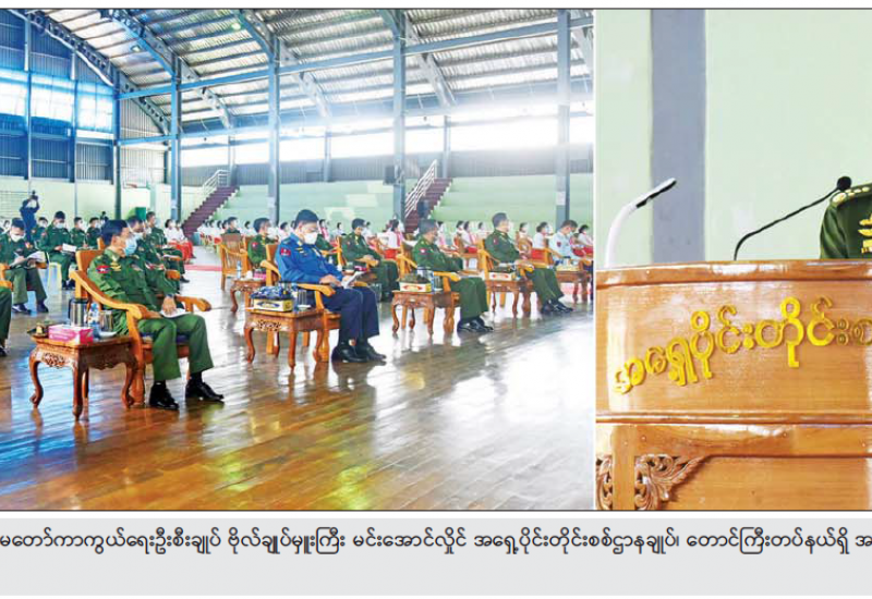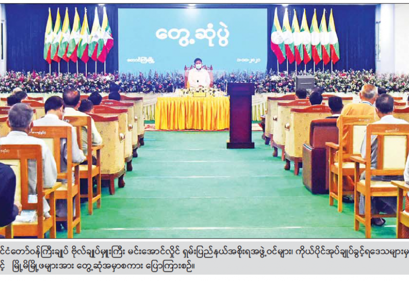 နိုင်ငံတော်စီမံ အုပ်ချုပ်ရေးကောင်စီဥက္ကဋ္ဌ၊ နိုင်ငံတော်ဝန်ကြီးချုပ် ဗိုလ်ချုပ်မှူးကြီး မင်းအောင်လှိုင်သည် ယနေ့ နံနက်ပိုင်းတွင် ရှမ်းပြည်နယ် အစိုးရအဖွဲ့ဝင်များ၊ ကိုယ်ပိုင်အုပ်ချုပ် ခွင့်ရဒေသများမှ တာဝန်ရှိသူများ၊ ဌာနဆိုင်ရာဝန်ထမ်းများ၊ ခရိုင်၊ မြို့နယ်စီမံအုပ်ချုပ်ရေး အဖွဲ့ဝင်များနှင့် မြို့မိမြို့ဖများအား တောင်ကြီးမြို့ရှိ ရှမ်းပြည်နယ်အစိုးရအဖွဲ့ရုံး အစည်းအဝေးခန်းမ၌ တွေ့ဆုံအမှာစကား ပြောကြား သည်။