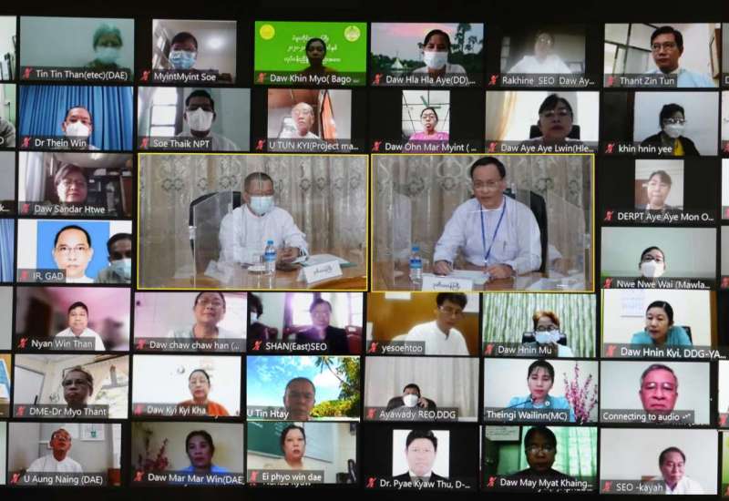 ကျောင်းပြင်ပတစ်သက်တာပညာရေး မိတ်ဖက်ပူးပေါင်းဆောင်ရွက်မှု မူဘောင်နှင့် အရည် အသွေး စံအကဲဖြတ်အညွှန်းဘောင် မိတ်ဆက်ခြင်းအခမ်းအနားကို ယနေ့ နံနက် ၁၀ နာရီတွင် Video Conferencing စနစ်ဖြင့်ကျင်းပရာ ပညာရေးဝန်ကြီးဌာန ဒုတိယဝန်ကြီးများ ဖြစ်ကြသော ဒေါက်တာဇော်မြင့်နှင့်ဦးဇော်ဝင်း၊ ညွှန်ကြားရေးမှူးချုပ်များ၊ ပါမောက္ခချုပ်များ၊ ဒုတိယအမြဲတမ်း