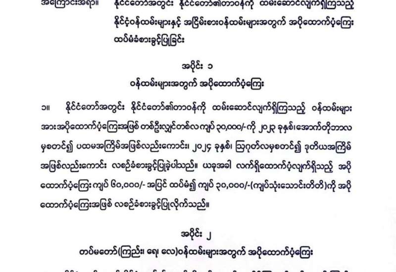 နိုင်ငံတော်အတွင်း နိုင်ငံတော်၏တာဝန်ကို ထမ်းဆောင်လျက်ရှိကြသည့် နိုင်ငံ့ဝန်ထမ်းများနှင့် အငြိမ်းစားဝန်ထမ်းများအတွက် အပိုထောက်ပံ့ကြေး ထပ်မံခံစားခွင့်ပြုခြင်း
