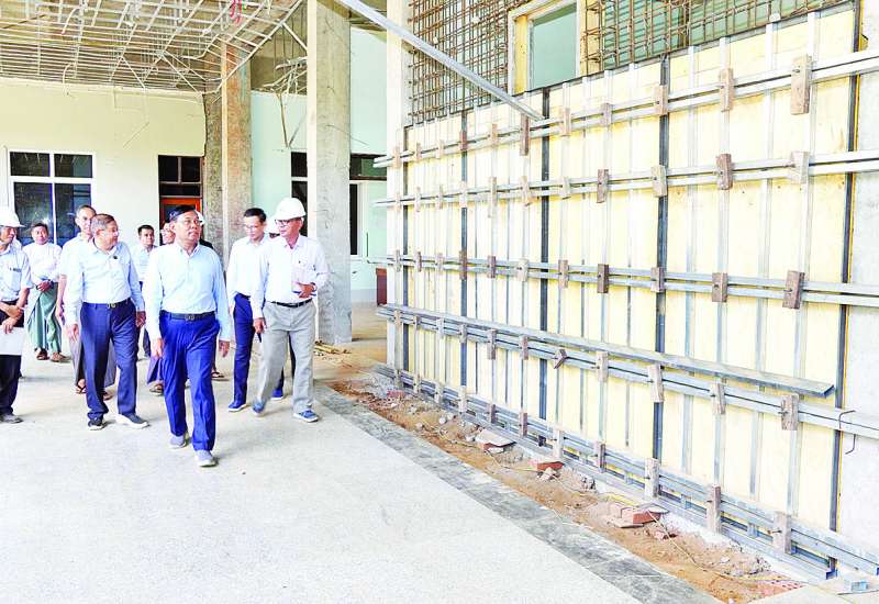 အဆောက်အအုံများ ပြန်လည်ပြုပြင်အသုံးပြုရေးနှင့် အသစ်တည်ဆောက်ရေး ကြီးကြပ်မှုကော်မတီဥက္ကဋ္ဌ ဆောက်လုပ်ရေးဝန်ကြီးဌာန ပြည်ထောင်စုဝန်ကြီး ဦးမျိုးသန့်သည် ဒုတိယဝန်ကြီး ဦးမျိုးမြင့်၊ နေပြည်တော်ကောင်စီအဖွဲ့ဝင်များ၊ အမြဲတမ်းအတွင်းဝန်နှင့်အတူ ယနေ့တွင် နေပြည်တော်ကောင်စီနယ်မြေအတွင်း မန္တလေးငလျင်ကြီးကြောင့် ပျက်စီးသွားသည့် ဝန်ထမ်းအိမ်ရာများအတွက် လေးခန်းတွဲလေးထပ်အဆောက်အအုံများ အသစ်ပြန်လည်တည်ဆောက်နေမှုအခြေအနေ၊ ရုံးအဆောက်အအုံများ ပြုပြင်ဆောင်ရွက်နေသည့် အခြေအနေတို့ကို ကြည့်ရှုစစ်ဆေးသည်။