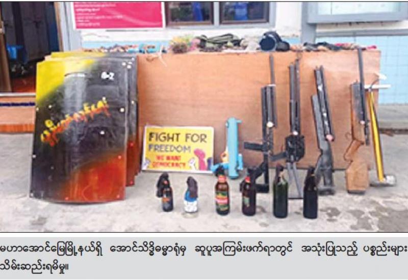 လုံခြုံရေးတပ်ဖွဲ့ဝင်များသည် ဆူပူအကြမ်းဖက်မှုလုပ်ရပ်များတွင် အသုံးပြုမည့် လက်နက်၊ ပစ္စည်း၊ ကိရိယာများအား ဆက်လက်ဖော်ထုတ်သိမ်းဆည်းရမိလျက်ရှိရာ မေလ ၁၈ ရက်နေ့ နံနက် ၁၁ နာရီ ၁၅ မိနစ်ခန့် တွင် စစ်ကိုင်းတိုင်းဒေသကြီး၊ ရွှေဘိုမြို့နယ်၊ ဆင်အင်းကျေးရွာရှိ ဦးမိုးအောင်(စိစစ်ဆဲ)ပိုင်ဆိုင်ပြီး လူနေထိုင်ခြင်းမရှိသည့် နေအိမ်အတွင်း၌ အဆိုပါကျေးရွာနေ ဇာနည်အောင်(ခ) အတာ(၃၄)နှစ် (ဘ)ဦးဆိတ်အောင်အား ဂျင်ကလိများ ပြုလုပ်နေသည်ကို တွေ့ရှိရပြီး ၎င်းအနီးမှ ဂျင်ကလိ ၃၃ ချောင်း၊ သံချောင်း ၁၀ ချောင်းနှင့်ဆက်စပ်ပစ္စည်းများအား သိမ်းဆည်းရမိခဲ့သည်။