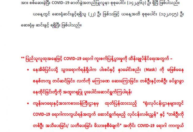 တပ်မတော်အနေဖြင့် တိုင်းစစ်ဌာနချုပ်နယ်မြေအသီးသီးရှိ ထေရ်ကြီးဝါကြီး ဆရာတော်ကြီးများ အပါအဝင် လူမျိုးမရွေး၊ ဘာသာမရွေး အသက်(၆၅)နှစ်အထက် သက်ကြီးဘိုးဘွားများ၊ ဌာနဆိုင်ရာဝန်ထမ်း များနှင့် တိုင်းရင်းသားပြည်သူများအား ကိုဗစ်-၁၉ ရောဂါ ကာကွယ် ဆေးထိုးနှံနိုင်ရေးအတွက် ဆေးပစ္စည်းများကို တပ်မတော် လေယာဉ်များဖြင့် သယ်ယူပို့ဆောင် ပေးခြင်းများနှင့် ကာကွယ်ဆေးထိုးနှံပေးခြင်းများ ဆောင်ရွက်ပေးလျက်ရှိသည်။