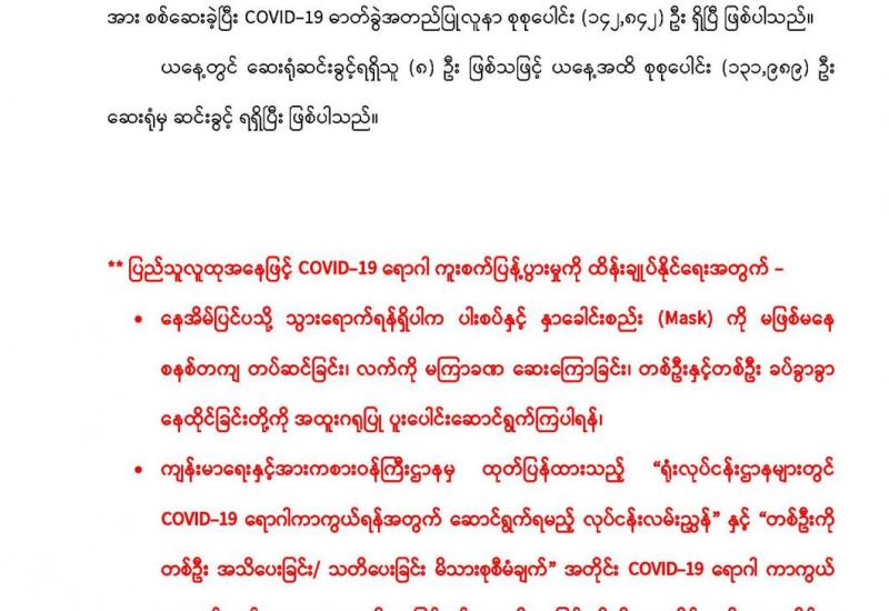တပ်မတော်အနေဖြင့် တိုင်းစစ်ဌာနချုပ်နယ်မြေအသီးသီးရှိ ထေရ်ကြီးဝါကြီး ဆရာတော်ကြီးများ အပါအဝင် လူမျိုးမရွေး၊ ဘာသာမရွေး အသက်(၆၅)နှစ်အထက် သက်ကြီးဘိုးဘွားများ၊ ဌာနဆိုင်ရာ ဝန်ထမ်းများနှင့် တိုင်းရင်းသားပြည်သူများအား Covid-19 ရောဂါ ကာကွယ်ဆေးထိုးနှံနိုင်ရေးအတွက် ဆေးပစ္စည်းများကို တပ်မတော်လေယာဉ်များဖြင့် သယ်ယူပို့ဆောင်ပေးခြင်းများနှင့် ကာကွယ်ဆေး ထိုးနှံပေးခြင်းများ ဆောင်ရွက် ပေးလျက်ရှိသည်။