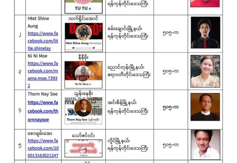 နိုင်ငံတော်၏ အုပ်ချုပ်မှုယန္တရားပျက်ပြားစေရန်ရည်ရွက်ချက်ဖြင့် နိုင်ငံ့ဝန်ထမ်းများအား CDM လှုပ်ရှားမှုတွင် ပါဝင်စေရန်လှုံ့ဆော်ခြင်း၊ CRPH မတရားအသင်းအား ထောက်ခံသည့် အကြောင်းအရာများ၊ မမှန်သတင်းများအား ဖြန့်ဝေခြင်း၊ နိုင်ငံတော်တည်ငြိမ်အေးချမ်းမှုကို ပျက်ပြားစေပြီး ဆူပူအုံကြွမှုဖြစ်ပေါ်စေရန်နှင့် အများပြည်သူ အထိတ်တလန့်ဖြစ်စေရန် အတွက် သွေးထိုးလှုံ့ဆော်မှုများ ပြုလုပ်ခြင်း၊ Social Punishment ပြုလုပ်ခြင်းများကို လူမှုကွန်ရက် စာမျက်နှာများတွင် ရည်ရွယ်ချက်ရှိရှိ ဖြင့်ဖော်ပြခြင်းနှင့် ဖြန့်ဝေခြင်းများ ဆောင်ရွက် လျက်ရှိသည့် အောက်ဖော်ပြပါ အနုပညာရှင်အချို့နှင့် အခြားပါဝင်ပတ်သက်သူများအား ရာဇသတ်ကြီးပုဒ်မ ၅၀၅-က ဖြင့် အမှုဖွင့်အရေးယူ ဆောင်ရွက်လျက်ရှိသည်။