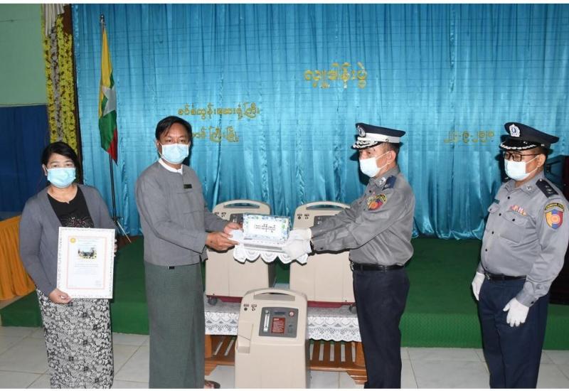 (၅၆)နှစ်မြောက် မြန်မာနိုင်ငံရဲတပ်ဖွဲ့နေ့ကို ကြိုဆိုဂုဏ်ပြုသောအားဖြင့် ကိုဗစ်-၁၉ ရောဂါ ဖြစ်ပွားနေသည့်ကာလအတွင်း အထောက်အကူဖြစ်စေရန်အတွက် ဆေးရုံသုံးပစ္စည်း အောက်ဆီ ဂျင်စက် နှင့် အဟာရဒါနအလှူငွေလှူဒါန်းခြင်း အခမ်းအနားကို ယနေ့နံနက်ပိုင်းတွင် တောင်ကြီးမြို့၊ စဝ်စံထွန်းဆေးရုံ၌ ကျင်းပသည်။
