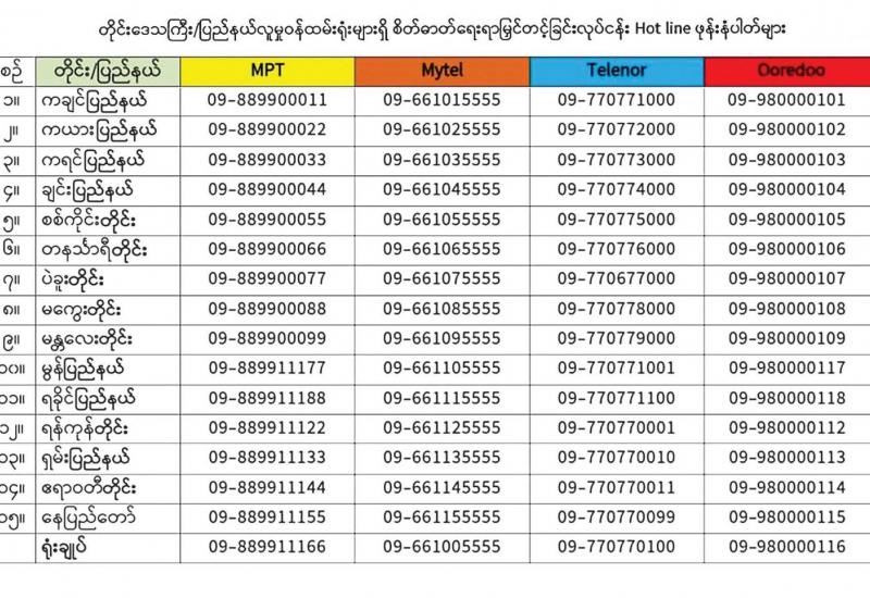 ကိုဗစ်-၁၉ ကပ်ရောဂါကြောင့် စိတ်ဖိစီးမှုလျော့ကျစေရန်နှင့် စိတ်ဓာတ်ရေးရာ မြင့်တက်စေရန် စိတ်ပိုင်းဆိုင်ရာ ပံ့ပိုးမှုပေးခြင်း၊ တွေ့ကြုံရသည့်အခြေအနေ၊ အခက်အခဲများကို ကိုယ်တိုင်ဆုံးဖြတ်ချက်ဖြင့် ဖြေရှင်းကျော်လွှားနိုင်ရန် နှစ်သိမ့်အားပေးပံ့ပိုးမှုပေးခြင်းတို့ကို လူမှုဝန်ထမ်း၊ ကယ်ဆယ်ရေးနှင့် ပြန်လည်နေရာချထားရေးဝန်ကြီးဌာန လူမှုဝန်ထမ်းဦးစီးဌာနက ဖုန်းဖြင့် ဝန်ဆောင်မှုပေးလျက်ရှိကြောင်း သိရသည်။