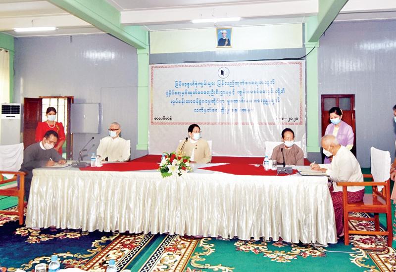 မြန်မာ့စွယ်စုံကျမ်းများ ပြန်လည်ထုတ်ဝေရေးအတွက် ပုံနှိပ်ရေးနှင့်ထုတ်ဝေရေးဦးစီးဌာန စာပေဗိမာန်နှင့် ထွန်းဖောင်ဒေးရှင်းတို့၏ လုပ်ငန်းတာဝန်ခွဲဝေမှုဆိုင်ရာ မူဘောင် သဘောတူညီချက်လက်မှတ်ရေးထိုးပွဲ အခမ်းအနားကို ယနေ့ညနေပိုင်းက ရန်ကုန်မြို့ ကျောက်တံတားမြို့နယ် ကုန်သည်လမ်းရှိ စာပေဗိမာန်၌ကျင်းပရာ ပြန်ကြားရေးဝန်ကြီးဌာန ပြည်ထောင်စုဝန်ကြီး ဒေါက်တာဖေမြင့် တက်ရောက်သည်။