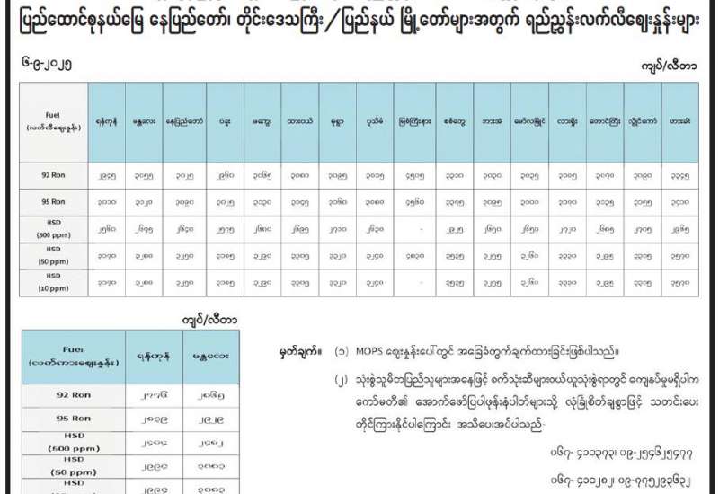 ရန်ကုန်မြို့နှင့် မန္တလေးမြို့အတွက် ရည်ညွှန်းလက်ကားဈေးနှုန်းများနှင့် ပြည်ထောင်စုနယ်မြေ နေပြည်တော်၊ တိုင်းဒေသကြီး/ပြည်နယ် မြို့တော်များအတွက် ရည်ညွှန်းလက်လီဈေးနှုန်းများ