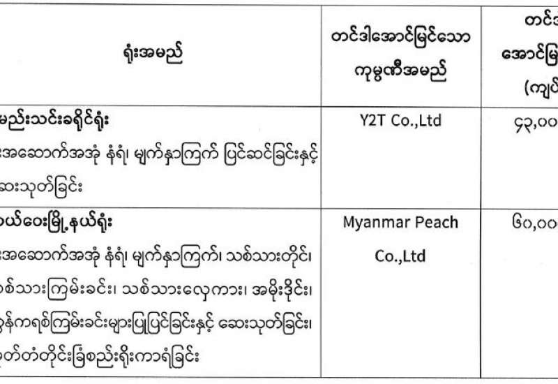 ၁။ လိုင်စင်ဆိုင်ရာ အခကြေးငွေများပေးသွင်းခြင်းနှင့် လုပ်ငန်းအစီရင်ခံစာများပေးပို့ခြင်းတို့အား ဆောင်ရွက်ရန်ပျက်ကွက်လျက်ရှိသည့် အောက်ဖော်ပြပါဆက်သွယ်ရေးဝန်ဆောင်မှု လုပ်ငန်းလိုင်စင်ကို ၂၀-၂-၂၀၂၃ နေ့တွင်ရရှိသော ကုမ္ပဏီများသည်ဆက်သွယ်ရေးဥပဒေပုဒ်မ ၁၅ အရ လိုင်စင်ရရှိသူ၏ တာဝန်များအား လိုက်နာရန်ပျက်ကွက်ခြင်းကြောင့် စီမံခန့်ခွဲရေးနည်းလမ်းဖြင့် အရေးယူသွားမည်ဖြစ်၍ လိုင်စင်ထုတ်ပေးခြင်းဆိုင်ရာ နည်းဥပဒေများ အပိုဒ် ၃၉ (က) (၂) အရ ထိုက်သင့်သော အခွင့်အရေးပေးသည့်အနေဖြင့် ၂၀၂၅ ခုနှစ်၊ စက်တင်ဘာလ (၁၂) ရက်နေ့ နောက်ဆုံးထားပြီး ဆက်သွယ်ရေးညွှန်ကြားမှုဦးစီးဌာနသို့ ဖြေရှင်းချက်နှင့်အတူ သက်ဆိုင်ရာအခကြေးငွေများ လာရောက်ပေးသွင်းပါရန်နှင့် သတ်မှတ်ရက်အတွင်း ပေးသွင်းခြင်းမရှိပါက ဆက်သွယ်ရေးဥပဒေ၊ နည်းဥပဒေပါ ပြဋ္ဌာန်းချက်များနှင့်အညီ အရေးယူမှုများကို ဆက်လက်ပြုလုပ်သွားမည်ဖြစ်ပါကြောင်း အသိပေးအကြောင်းကြားပါသည်-