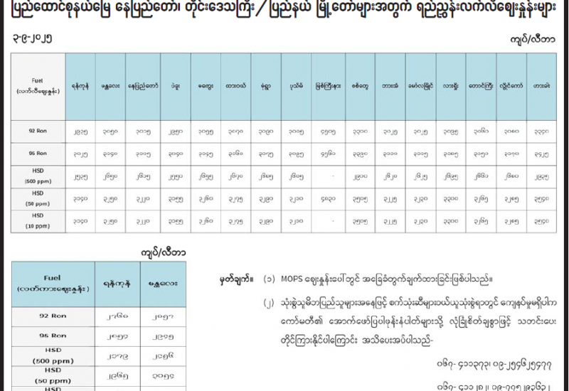 ရန်ကုန်မြို့နှင့် မန္တလေးမြို့အတွက် ရည်ညွှန်းလက်ကားဈေးနှုန်းများနှင့် ပြည်ထောင်စုနယ်မြေ နေပြည်တော်၊ တိုင်းဒေသကြီး/ပြည်နယ် မြို့တော်များအတွက် ရည်ညွှန်းလက်လီဈေးနှုန်းများ
