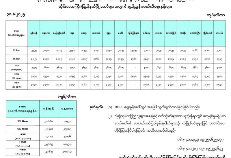 ရန်ကုန်မြို့နှင့် မန္တလေးမြို့အတွက် ရည်ညွှန်းလက်ကားဈေးနှုန်းများနှင့် ပြည်ထောင်စုနယ်မြေ နေပြည်တော်၊ တိုင်းဒေသကြီး/ပြည်နယ် မြို့တော်များအတွက် ရည်ညွှန်းလက်လီဈေးနှုန်းများ