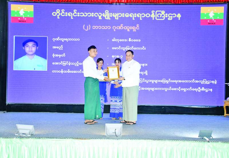 တိုင်းရင်းသားလူမျိုးများရေးရာဝန်ကြီးဌာန ၂၀၂၅ ခုနှစ် တက္ကသိုလ်ဝင်စာမေးပွဲတွင် အောင်မြင်သူများအား ဆုချီးမြှင့်ပွဲနှင့် ထောက်ပံ့ပစ္စည်းပေးအပ်ပွဲအခမ်းအနားကို ယနေ့မွန်းလွဲပိုင်းတွင် တိုင်းရင်းသားလူမျိုးများရေးရာဝန်ကြီးဌာန အစည်းအဝေးခန်းမ၌ကျင်းပရာ နယ်စပ်ရေးရာဝန်ကြီးဌာနနှင့် တိုင်းရင်းသားလူမျိုးများရေးရာ ဝန်ကြီးဌာန ပြည်ထောင်စုဝန်ကြီး ဒုတိယဗိုလ်ချုပ်ကြီးရာပြည့်၊ ဒုတိယဝန်ကြီး ဦးဇော်အေးမောင်၊ အမြဲတမ်းအတွင်းဝန်၊ ဌာနဆိုင်ရာတာဝန်ရှိသူများ၊ အရာထမ်း၊ အမှုထမ်းများ၊ ကျောင်းသား ကျောင်းသူများနှင့် ကျောင်းသားမိဘများ တက်ရောက်ကြသည်။