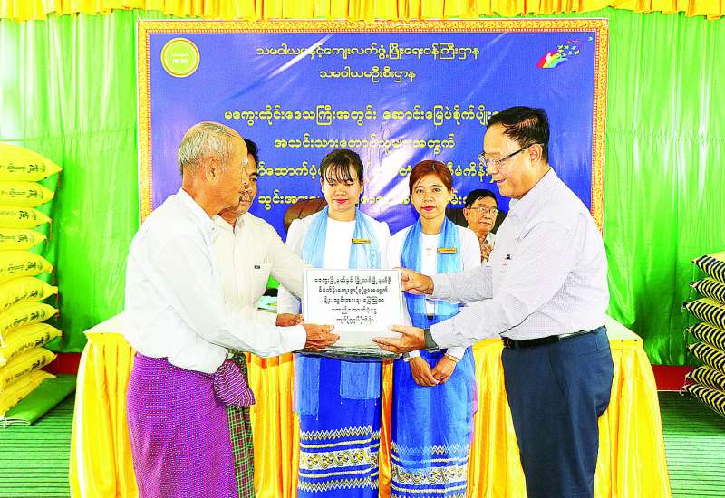 မြို့သစ်မြို့နယ်အတွင်း နိုင်ငံ့စီးပွားမြှင့်တင်ရေးရန်ပုံငွေနှင့် အကျုံးမဝင်သော မိုးစပါးစိုက်တောင်သူများသို့ သီးနှံပေါ်ပေးစနစ်ဖြင့် သွင်းအားစုဓာတ်မြေဩဇာများပေးအပ်ပွဲနှင့် ဆောင်းမြေပဲစိုက်တောင်သူများအတွက် နိုင်ငံတော်ထောက်ပံ့ရန်ပုံငွေဖြင့် မျိုး၊ သွင်းအားစု၊ မြေဩဇာပေးအပ်ပွဲအခမ်းအနားကို ယနေ့နံနက်ပိုင်းတွင် မြို့သစ်မြို့စိုက်ပျိုးရေးဦးစီးဌာန စိုက်ပျိုးပညာပေးရေးနှင့် ဒေသဖွံ့ဖြိုးရေးသင်တန်းကျောင်းခန်းမ၌ကျင်းပရာ သမဝါယမနှင့်ကျေးလက်ဖွံ့ဖြိုးရေးဝန်ကြီးဌာန ပြည်ထောင်စုဝန်ကြီး ဦးလှမိုး၊ မကွေးတိုင်းဒေသကြီးဝန်ကြီးချုပ် ဦးတင့်လွင်၊ တိုင်းဒေသကြီးဝန်ကြီးများနှင့် ဌာနဆိုင်ရာတာဝန်ရှိသူများ တက်ရောက်ကြသည်။