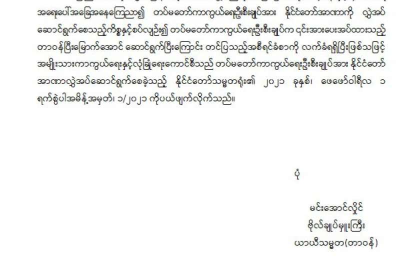 အကြမ်းဖက်အုပ်စုအဖြစ်ကြေညာထားသည့် CRPH ၊ NUG နှင့် ယင်းတို့၏ လက်ဝေခံအဖွဲ့အစည်းများ၊ ယင်းတို့နှင့် ဆက်နွှယ်နေသော အဖွဲ့အစည်းများ၊ လူပုဂ္ဂိုလ်များသည် နိုင်ငံတော်တည်ငြိမ်အေးချမ်းရေးကို ပျက်ပြားစေရန်နှင့် အစိုးရယန္တရားများ ပျက်ပြားစေရန် ရည်ရွယ်လျက်လှုံ့ဆော်ခြင်း၊ ဝါဒဖြန့်ခြင်းများပြုလုပ်ခဲ့မှုအပေါ် ဥပဒေနှင့်အညီ ထိရောက်စွာ အရေးယူသွားမည်ဖြစ်ကြောင်းနှင့် ထိုသို့လှုံ့ဆော်သူ၊ ဝါဒဖြန့်သူများအား ဆက်လက်ဖော်ထုတ် အရေးယူသွားမည်ဖြစ် ကြောင်း မိဘပြည်သူများသိရှိနိုင်ရေး အသိပေးသတင်းထုတ်ပြန်ပြီးဖြစသည်။