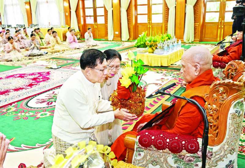 ၂၀၂၅ ခုနှစ်၊ ကာကွယ်ရေးဦးစီးချုပ်ရုံး (ကြည်း၊ ရေ၊ လေ) မိသားစုများ ဝါဆိုသင်္ကန်းဆက်ကပ်လှူဒါန်းပွဲ မင်္ဂလာအခမ်းအနားကို ယနေ့နံနက်ပိုင်းတွင် ကာကွယ်ရေးဦးစီးချုပ်ရုံး (ကြည်း)၊ အနော်ရထာခန်းမ၌ ကျင်းပပြုလုပ်ရာ နိုင်ငံတော်စီမံအုပ်ချုပ်ရေးကောင်စီဥက္ကဋ္ဌ တပ်မတော်ကာကွယ်ရေးဦးစီးချုပ် ဗိုလ်ချုပ်မှူးကြီး မင်းအောင်လှိုင်နှင့် ဇနီး ဒေါ်ကြူကြူလှတို့ တက်ရောက်ကြည်ညို၍ ဝါဆိုသင်္ကန်း၊ လှူဖွယ်ပစ္စည်းများနှင့် နေ့ဆွမ်းတို့ကို ဆက်ကပ်လှူဒါန်းသည်။