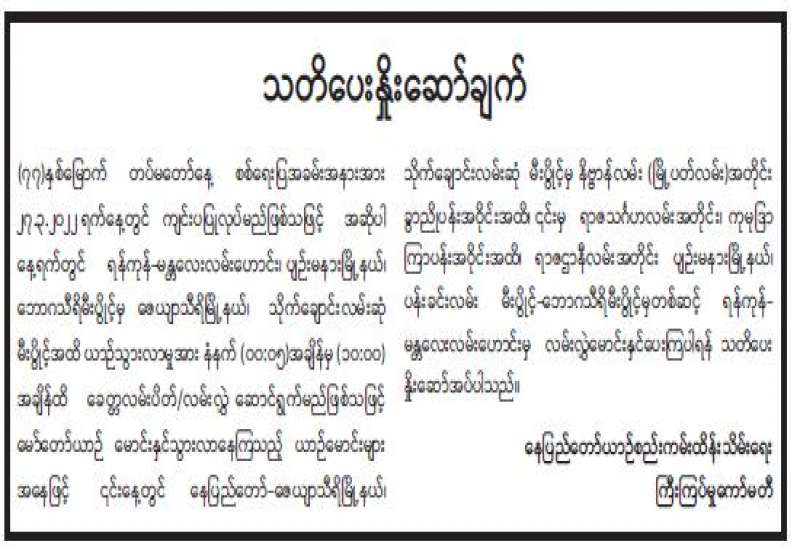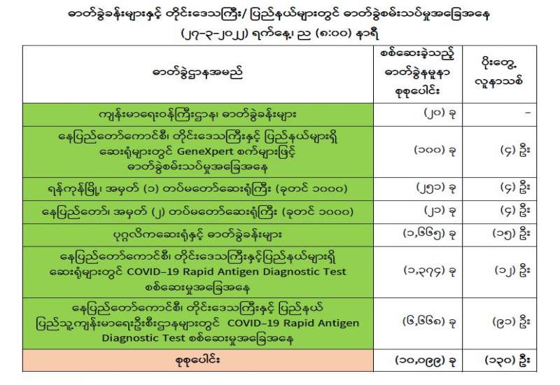 (၂၇-၃-၂၀၂၂) ရက်နေ့၊ ည (၈:၀၀) နာရီ ကျန်းမာရေးဝန်ကြီးဌာနအနေဖြင့် နိုင်ငံအတွင်း ကူးစက်ဖြစ်ပွားနေသော COVID-19 ရောဂါ ကာကွယ်၊ ကုသ၊ ထိန်းချုပ်ရေး လုပ်ငန်းများကို အရှိန်အဟုန်မြှင့်ဆောင်ရွက်လျက်ရှိရာ ရောဂါထိန်းချုပ်ရေးလုပ်ငန်းများ အောင်မြင်နိုင်ရေးအတွက် ပြည်သူလူထု အနေဖြင့် ကျန်းမာရေးဝန်ကြီးဌာနမှ ထုတ်ပြန်ထားသော COVID-19 ရောဂါကာကွယ်ထိန်းချုပ်ရေးဆိုင်ရာ စည်းကမ်းများကို စနစ် တကျလိုက်နာ ဆောင်ရွက်ရန်လိုအပ်ပြီး COVID-19 ကာကွယ်ဆေးထိုးနှံမှုခံယူခြင်းအား အထူးဂရုပြု ပူးပေါင်းဆောင်ရွက်ကြရန် လိုအပ်ပါသည်။
