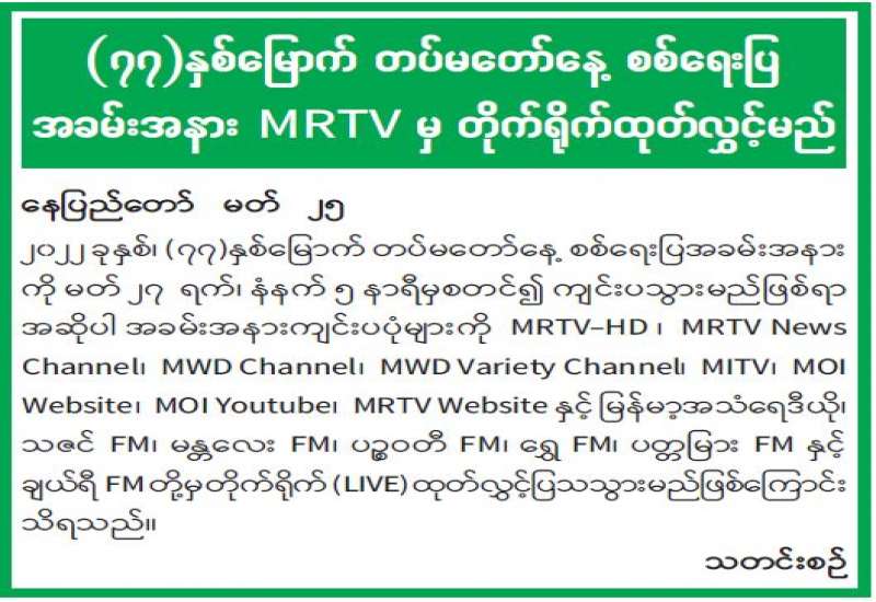 ၂၀၂၂ ခုနှစ်၊ မတ်လ ၂၇ ရက်နေ့တွင် ကျရောက်သည့် (၇၇)နှစ် မြောက် တပ်မတော်နေ့ကို ဂုဏ်ပြုသောအားဖြင့် နိုင်ငံကျော်အနုပညာရှင်များက ဂီတဖျော်ဖြေပွဲကို ယနေ့ညပိုင်းတွင် နေပြည်တော်ရှိ ဇေယျာသီရိဗိမာန် သဘင်ဆောင်၌ ကျင်းပပြုလုပ်သည်။