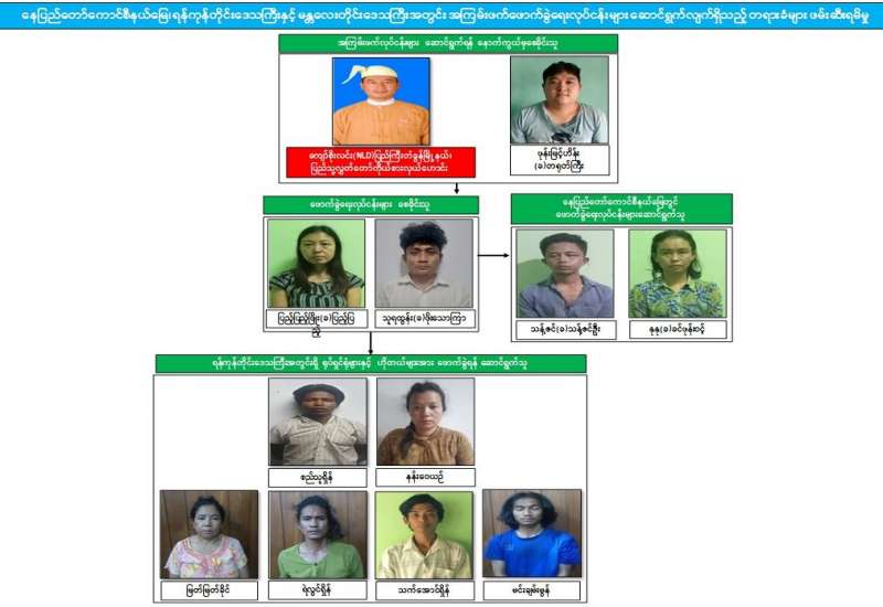 နိုင်ငံတော်အစိုးရအနေဖြင့် CRPH၊ NUG နှင့် PDF အမည်ခံ အကြမ်းဖက်အဖွဲ့များမှ ပြည်သူလူထု အထိတ်အလန့်ဖြစ်စေရန်အတွက် ဖောက်ခွဲဖျက်ဆီးခြင်းနှင့် အပြစ်မဲ့ ပြည်သူများအား လုပ်ကြံသတ်ဖြတ်ခြင်းစသည့် အကြမ်းဖက်လုပ်ရပ်များအား ဆောင်ရွက်နိုင်မှုမရှိစေရေး ဖော်ထုတ်ဖမ်းဆီးခြင်းများအား နေ့/ညမပြတ် ဆောင်ရွက်လျက်ရှိရာ အေးချမ်းစွာနေထိုင်လိုသည့် တာဝန်သိပြည်သူတစ်ဦး၏ သတင်းပေးပို့ချက်အရ ၂၀၂၂ ခုနှစ်၊ မတ်လ ၂၃ ရက် ညပိုင်းတွင် လမ်းမတော်မြို့နယ်၊ ဆေးတက္ကသိုလ်(၁)၊ ဝန်ထမ်းအိမ်ရာ၌ ရန်ကုန်တိုင်းဒေသကြီးအတွင်းရှိ ရုပ်ရှင်ရုံများအား အကြမ်းဖက် ဖောက်ခွဲရန်စီစဉ် ဆောင်ရွက်လျက်ရှိသူ စည်သူရှိန်(၃၈)နှစ်နှင့်အတူ မြတ်မြတ်ခိုင်(၅၇) နှစ်၊ ရဲလွင်ရှိန်(၃၁)နှစ်၊ သက်အောင်ရှိန်(၂၉)နှစ်၊ မင်းချမ်းမွန်(၂၀)နှစ်တို့အား လက်လုပ် မိုင်း ၃ လုံး၊ လက်ကိုင်ဖုန်း ၆ လုံးတို့နှင့်အတူ ဖမ်းဆီးရမိခဲ့သည်။