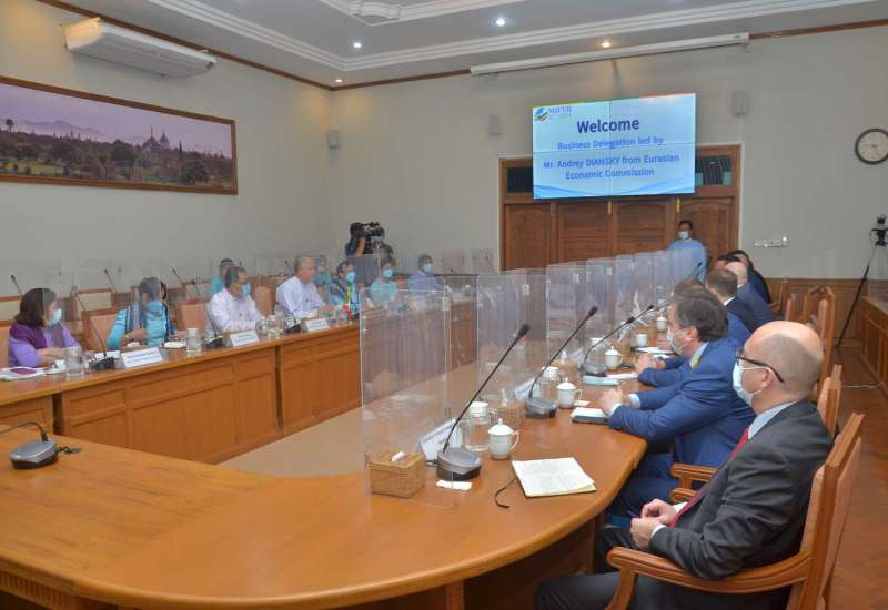 မြန်မာနိုင်ငံနှင့် ဥရောပအာရှစီးပွားရေးသမဂ္ဂ(EAEU)တို့အကြား ရင်းနှီးမြှုပ်နှံမှုနှင့် ကုန်သွယ်မှု မြှင့်တင်ဆောင်ရွက်သွားနိုင်ရန် ရည်ရွယ်၍ နှစ်ဖက်အစိုးရအဖွဲ့အစည်းများနှင့် စီးပွားရေး လုပ်ငန်းရှင်များပါဝင်သော ဆွေးနွေးပွဲကို ယနေ့ မွန်းလွဲ ၁ နာရီတွင် ရင်းနှီးမြှုပ်နှံမှုနှင့် နိုင်ငံခြားစီးပွားဆက်သွယ်ရေး ဝန်ကြီးဌာနနှင့် ဥရောပအာရှ စီးပွားရေးကော်မရှင်တို့က ဦးဆောင် ၍ နေပြည်တော်ရှိ Park Royal Hotel ၌ ကျင်းပသည်။