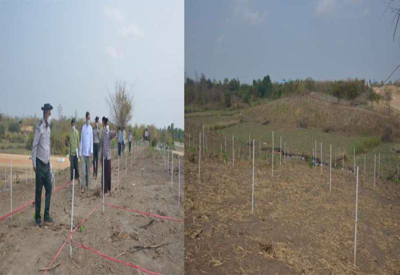 သယံဇာတနှင့် သဘာဝပတ်ဝန်းကျင်ထိန်းသိမ်းရေးဝန်ကြီးဌာန ပြည်ထောင်စုဝန်ကြီး ဦးခင်မောင်ရီသည် ယနေ့ မွန်းလွဲပိုင်းတွင် လယ်ဝေးမြို့နယ်၊ ရန်အောင်မြေကြိုးဝိုင်း၊ အကွက် အမှတ်(၁၃)ရှိ ၂၀၂၂ ခုနှစ်၊ မိုးအကြို လူထုလှုပ်ရှားမှုဖြင့် သစ်ပင်စိုက်ပျိုးမည့် မြေနေရာ (၆ ဒသမ ၈) ဧကကို ကြည့်ရှုစစ်ဆေးရာ သစ်တောဦးစီးဌာန၊ ညွှန်ကြားရေး မှူးချုပ်နှင့် တာဝန်ရှိသူများက ပန္နက်စိုက်ထူပြီးစီးမှု၊ ကျင်းတူးခြင်း၊ နွားချေး၊ မြေဆွေးထည့်ခြင်း၊ ကျင်းဖို့ခြင်း ဆောင်ရွက်မည့် အစီအမံများ၊ မြေပြိုရေတိုက်စားနိုင်သည့် နေရာများတွင် ဗာတီဗာမြက် စိုက်ပျိုးမည့်အခြေအနေ၊ ကွန်တိုကန်သင်းအလိုက် သရုပ်ပြစိုက်ပျိုးမည့် အစီအစဉ်၊ ကျောက်စီ နှုန်းထိန်းတမံ ဆောင်ရွက်မည့် အစီအမံများအား ရှင်းလင်းတင်ပြသည်။