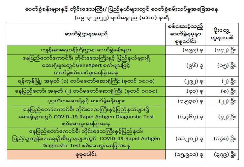 ကျန်းမာရေးဝန်ကြီးဌာနအနေဖြင့် နိုင်ငံအတွင်း ကူးစက်ဖြစ်ပွားနေသော COVID-19 ရောဂါ ကာကွယ်၊ ကုသ၊ ထိန်းချုပ်ရေး လုပ်ငန်းများကို အရှိန်အဟုန်မြှင့် ဆောင်ရွက်လျက်ရှိပါသည်။
