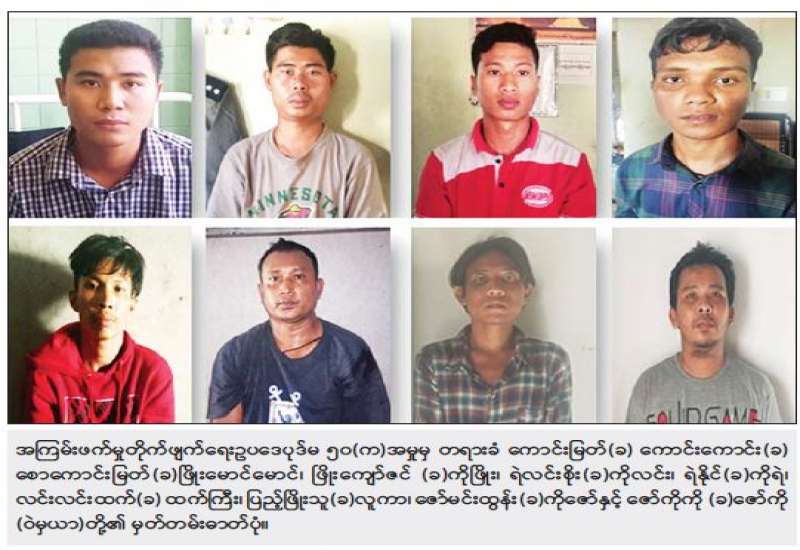 ရန်ကုန်တိုင်းဒေသကြီး၊ လှိုင်သာယာ(အနောက်ပိုင်း)မြို့နယ်၊ လှိုင်သာယာ (အရှေ့ပိုင်း) မြို့နယ်နှင့် ကြည့်မြင်တိုင်မြို့နယ်များနေ ကောင်းကောင်း (ခ) ကောင်းမြတ်(ခ) စောကောင်းမြတ် (ခ) ဖြိုးမောင်မောင်(ဘ)ဦးရဲမြင့်၊ ဖြိုးကျော်ဇင် (ခ) ကိုဖြိုး(ဘ)ဦးအောင်ကျော်စိုး၊ ရဲလင်းစိုး(ခ) ကိုလင်း (ဘ) ဦးလှအုန်း၊ ရဲနိုင်(ခ) ကိုရဲ(ဘ) ဦးသန်းဇော်ဦး၊ လင်းလင်းထက်(ခ) ထက်ကြီး (ဘ)ဦးကျော်ဆွေ၊ ပြည့်ဖြိုးသူ (ခ) လူကာ(ဘ)ဦးပြည့်စုံဝင်း၊ ဇော်မင်းထွန်း(ခ) ကိုဇော်(ဘ) ဦးချစ်စိန်နှင့် ဇော်ကိုကို (ဘ)ဦးတင်ဝင်းတို့သည် လှိုင်သာယာ(အနောက်ပိုင်း)မြို့နယ်ရှိ သောင်ကြီးနယ်မြေရဲစခန်းအား ဗုံးပစ်လောင်ချာဖြင့် ပစ်ခတ်တိုက်ခိုက်ခြင်း၊ အများပြည်သူများ သွားလာလျက်ရှိသည့်နေရာများ၊