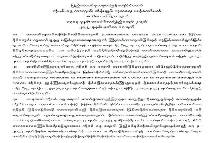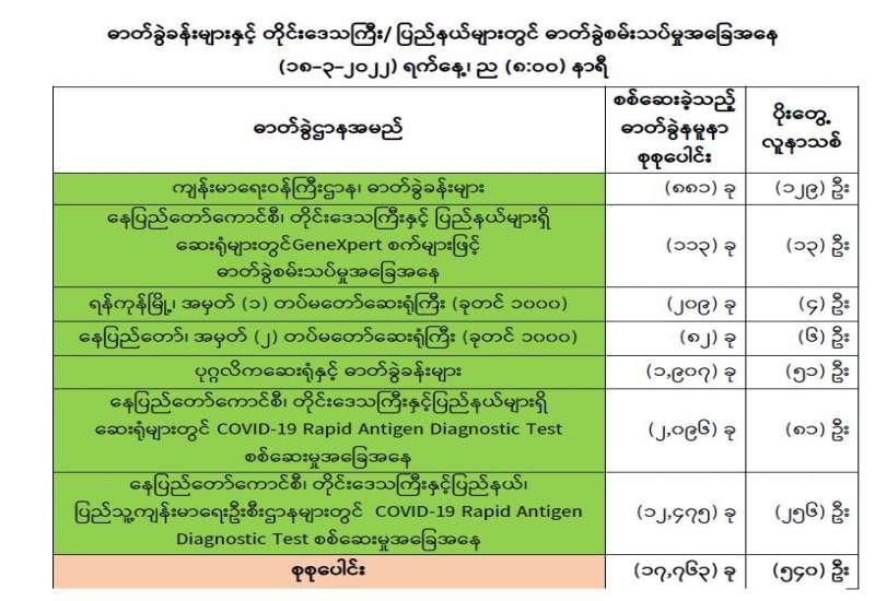 ကျန်းမာရေးဝန်ကြီးဌာနအနေဖြင့် နိုင်ငံအတွင်း ကူးစက်ဖြစ်ပွားနေသော COVID-19 ရောဂါ ကာကွယ်၊ ကုသ၊ ထိန်းချုပ်ရေးလုပ်ငန်းများကို အရှိန်အဟုန်မြှင့်ဆောင်ရွက်လျက်ရှိပါသည်။