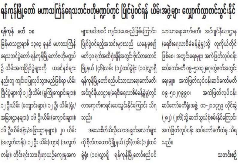 စီးပွားရေးနှင့် ကူးသန်းရောင်းဝယ်ရေးဝန်ကြီးဌာနနှင့် မြန်မာနိုင်ငံ စက်သုံးဆီ တင်သွင်းရောင်းချ ဖြန့်ဖြူးရေးအသင်းတို့ ပူးပေါင်းစီစဉ်မှုဖြင့် ပြည်သူများသက်သာသော ဈေးနှုန်းဖြင့်ဝယ်ယူ ရရှိနိုင်ရန်ရည်ရွယ်၍ ဗဟိုဘဏ်မှ ရည်ညွှန်းငွေလဲနှုန်းဖြင့် တိုက်ရိုက်ရောင်းချပေးသည့် နိုင်ငံခြား ငွေအမေရိကန်ဒေါ်လာ ၃၉ သန်းဖြင့် စက်သုံးဆီမှာယူတင် သွင်းခဲ့သည့် ကုမ္ပဏီ ၂၆ ခုမှ ဒီဇယ်ဆီ ဂါလံ ၁၂ ဒသမ ၅၄ သန်းခန့်ကို အထူးဈေးနှုန်းဖြင့် ဖြန့်ဖြူးရောင်းချပေးလျက်ရှိပြီး မတ်လ ၁၉ ရက် နေ့တွင် ကုမ္ပဏီ ၁၂ ခုမှ တိုင်းဒေသကြီး/ ပြည်နယ်များရှိ စက်သုံးဆီ အရောင်းဆိုင် စုစုပေါင်း ၁၁၃ ဆိုင်တွင် ဖြန့်ဖြူးရောင်းချ ပေးသွားမည်ဖြစ်သည်။