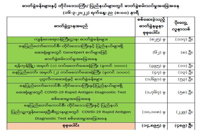 ကျန်းမာရေးဝန်ကြီးဌာနအနေဖြင့် နိုင်ငံအတွင်း ကူးစက်ဖြစ်ပွားနေသော COVID-19 ရောဂါ ကာကွယ်၊ ကုသ၊ ထိန်းချုပ်ရေးလုပ်ငန်းများကို အရှိန်အဟုန်မြှင့်ဆောင်ရွက်လျက်ရှိရာ ရောဂါ ထိန်းချုပ်ရေး လုပ်ငန်းများ အောင်မြင်နိုင်ရေးအတွက် ပြည်သူလူထုအနေဖြင့် ကျန်းမာရေးဝန်ကြီးဌာနမှ ထုတ်ပြန်ထားသော COVID-19 ရောဂါကာကွယ်ထိန်းချုပ်ရေးဆိုင်ရာစည်းကမ်းများကို စနစ် တကျလိုက်နာ ဆောင်ရွက်ရန်လိုအပ်ပြီး COVID-19 ကာကွယ်ဆေးထိုးနှံမှုခံယူခြင်းအား အထူးဂရုပြု ပူးပေါင်းဆောင်ရွက်ကြရန် လိုအပ်ပါသည်။