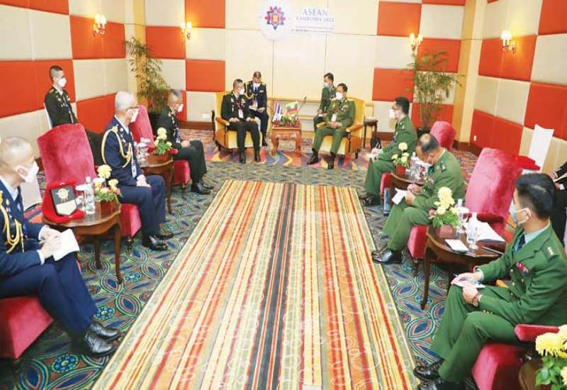 (၁၉)ကြိမ်မြောက် အာဆီယံ တပ်မတော်ကာကွယ်ရေးဦးစီးချုပ်များ အစည်းအဝေး 19 th ASEAN chiefs of Defence Forces Meeting (ACDFM-19) တက်ရောက်ရန် ကမ္ဘောဒီးယားနိုင်ငံသို့ ရောက်ရှိနေသည့် ညှိနှိုင်းကွပ်ကဲရေးမှူး (ကြည်း၊ ရေ၊ လေ) ဗိုလ်ချုပ်ကြီး မောင်မောင်အေးသည် ယနေ့တွင် အာဆီယံနိုင်ငံများမှ တပ်မတော်ကာကွယ်ရေးဦးစီးချုပ်များ၊ တာဝန်ရှိသူများနှင့် SOKHA Hotel ရှိ အစည်းအဝေးခန်းမ၌ သီးခြားစီတွေ့ဆုံသည်။