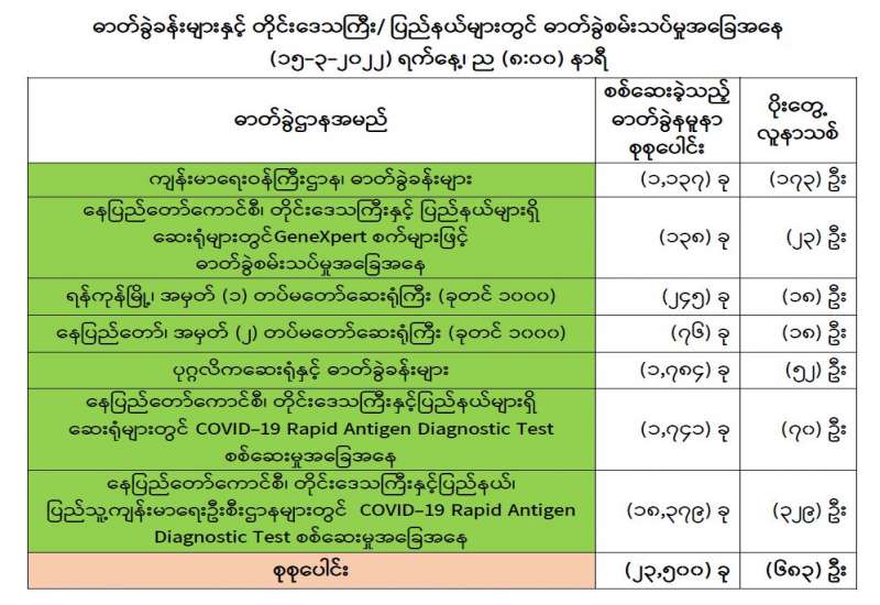 ကျန်းမာရေးဝန်ကြီးဌာနအနေဖြင့် နိုင်ငံအတွင်း ကူးစက်ဖြစ်ပွားနေသော COVID-19 ရောဂါ ကာကွယ်၊ ကုသ၊ ထိန်းချုပ်ရေးလုပ်ငန်းများကို အရှိန် အဟုန်မြှင့်ဆောင်ရွက်လျက်ရှိပါသည်။